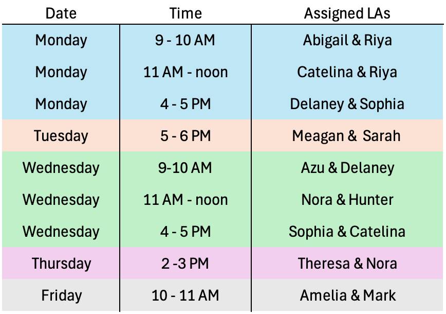- LAs are NOT expected to work with you when they are not “on-duty” (e.g., if they are using the study center as a study space for themselves).